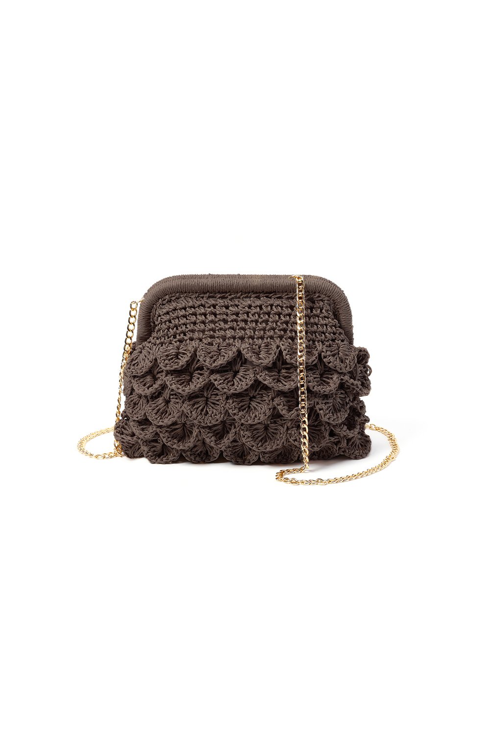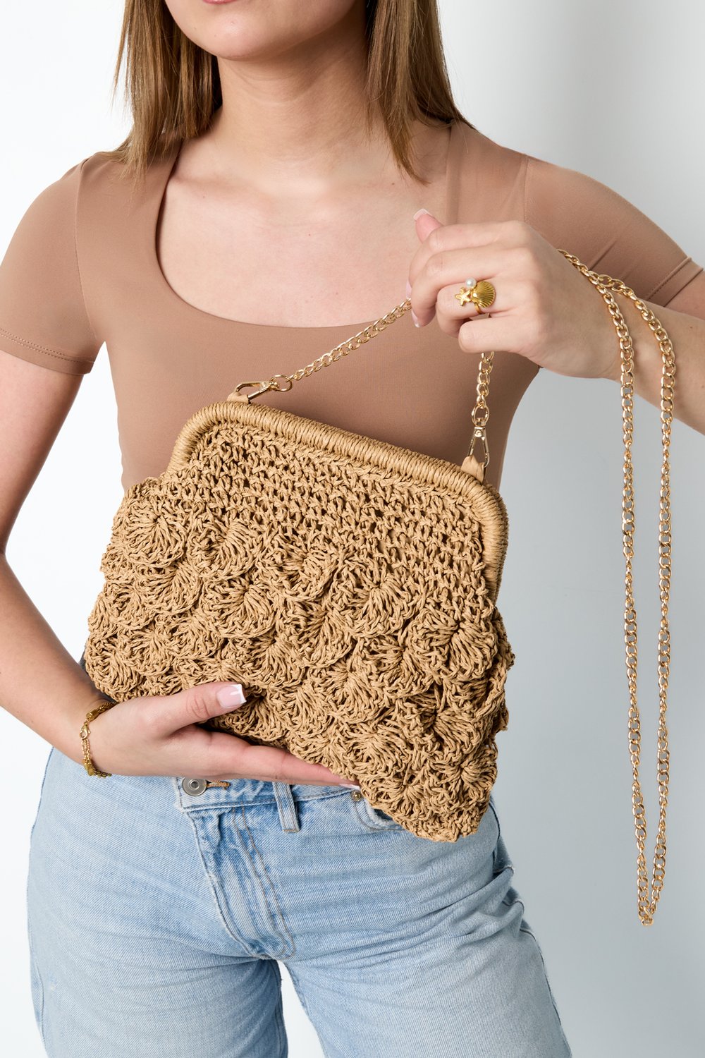 Je kunt hem als clutch gebruiken, maar ook omhangen met de kettingriem (afneembaar)